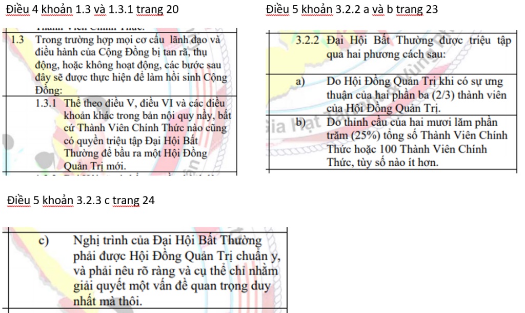 “Thể theo điều V, điều VI và các điều khoản khác trong bản nội quy nầy, bất cứ Thành Viên Chính Thức nào cũng có quyền triệu tập Ðại Hội Bất Thường để bầu ra một Hội Ðồng Quản Trị mới.”
