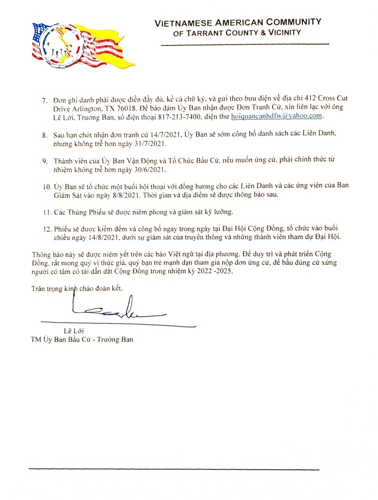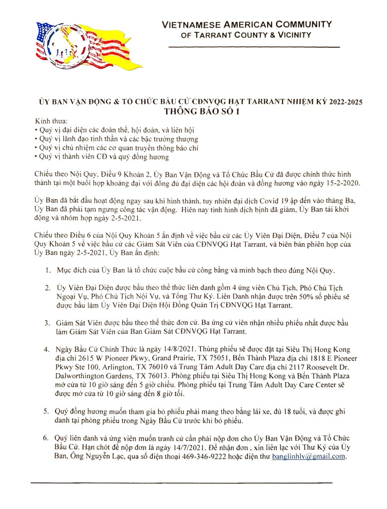 Ủy Ban Vận Động & Tổ Chức Bầu Cử – Thông Báo Số 1 Share this: Click to share on X (Opens in new window) X Click to share on Facebook (Opens in new window) Facebook Like Loading... Related