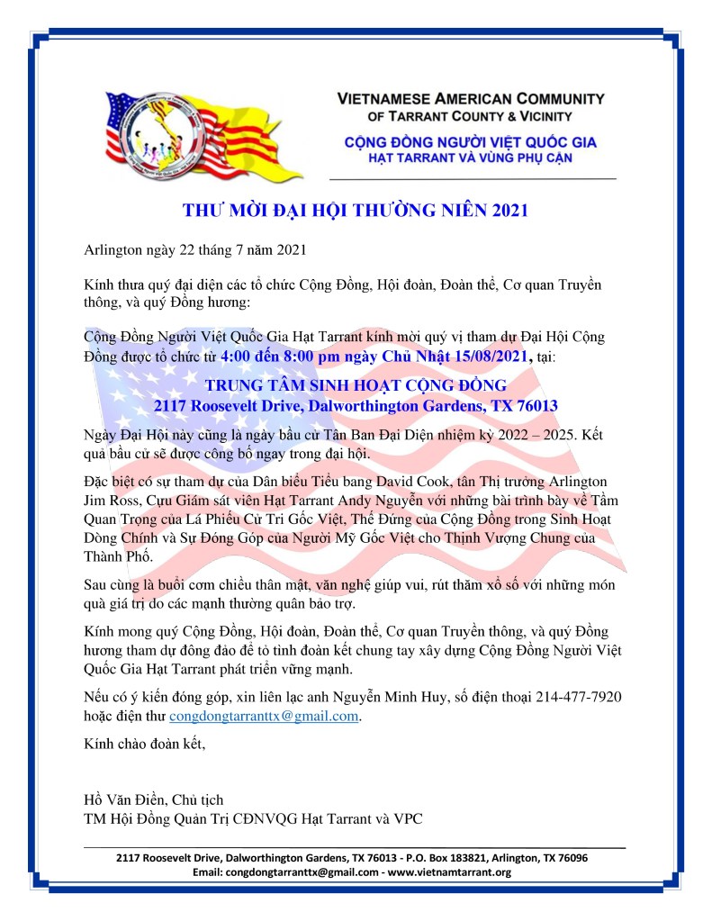 Flyer & Thư Mời Tham Dự Đại Hội Thường Niên 2021 Share this: Click to share on X (Opens in new window) X Click to share on Facebook (Opens in new window) Facebook Like Loading... Related