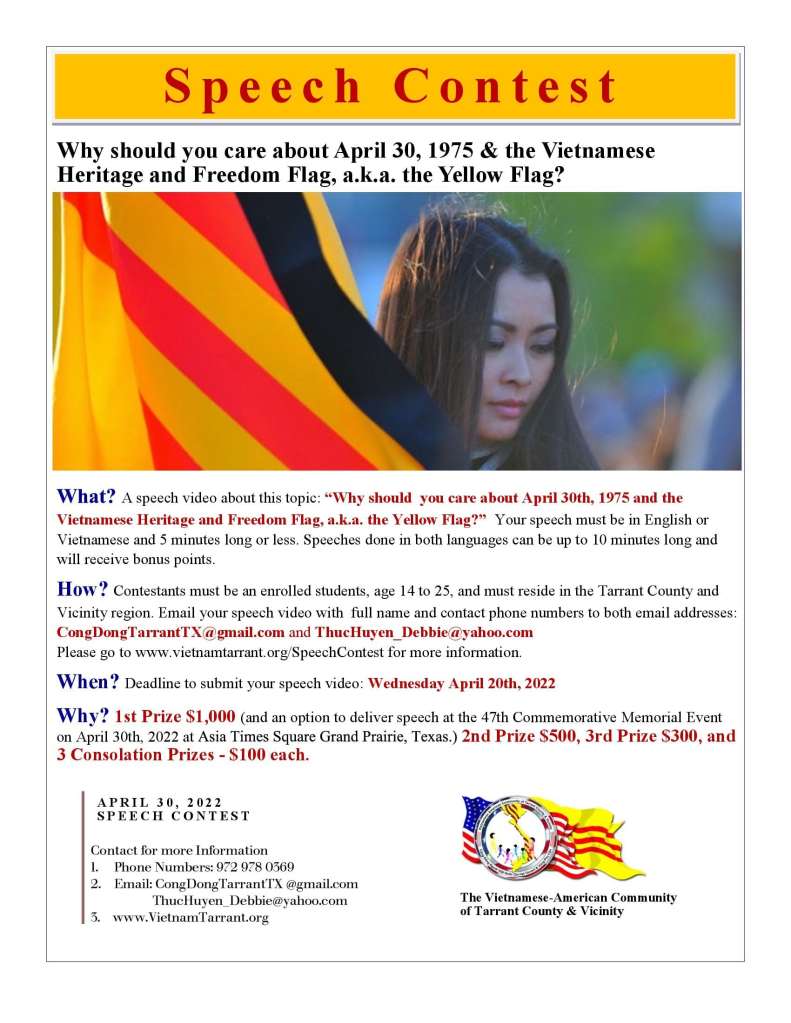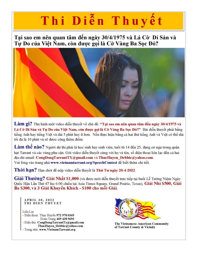 Điều kiện dự thi: Thí sinh phải cư ngụ tại Quận Hạt Tarrant và vùng phụ cận (các quân hạt xung quanh, có chung đường biên giới với Hạt Tarrant) và là học sinh tuổi từ 14 đến 25. Xin đọc kỹ thông báo, nếu có câu hỏi, vui lòng email hoặc gọi các số điện thoại liên lạc để được trả lời thỏa đáng.
